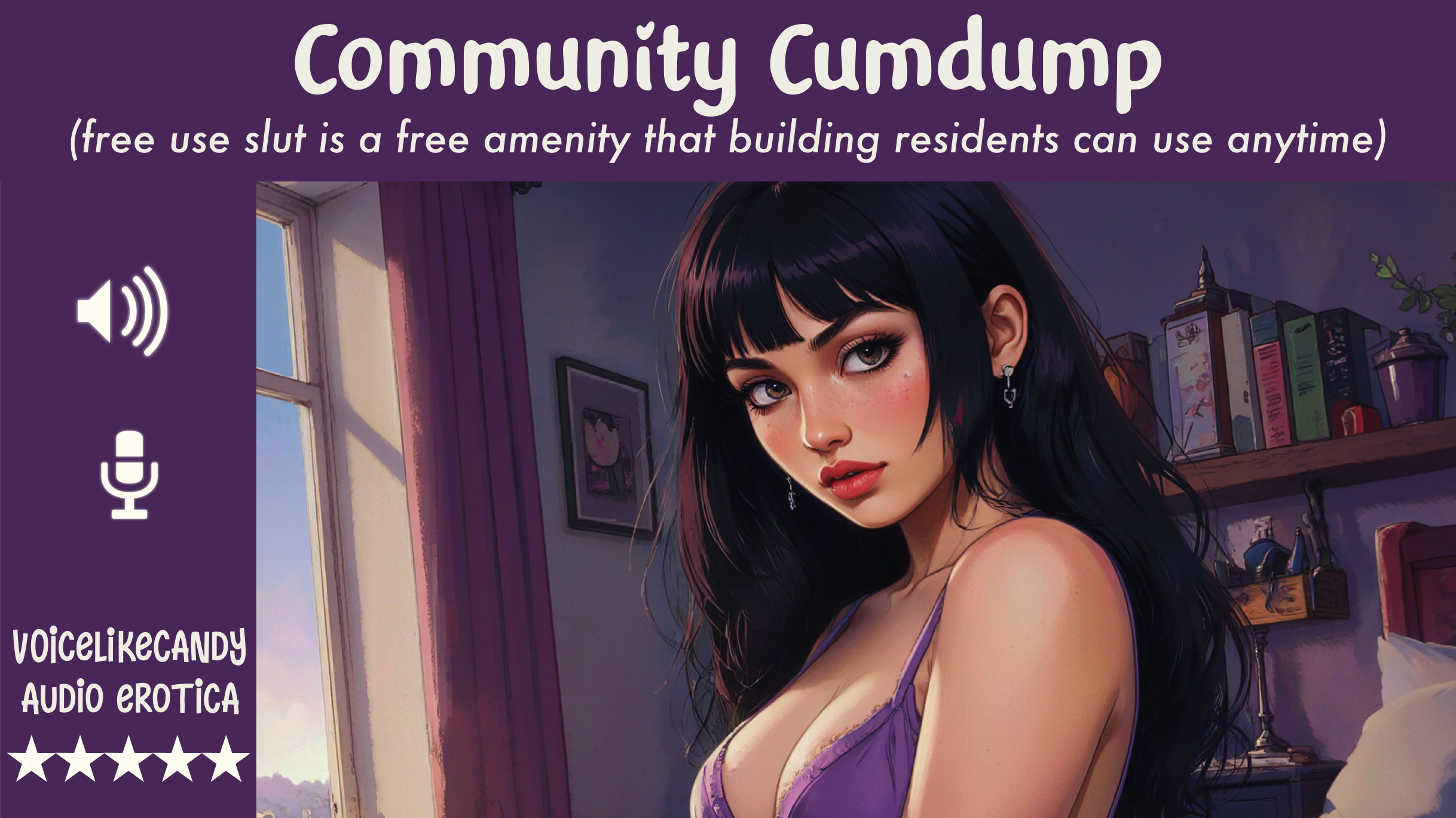 You’ve just moved into your new apartment when there is a knock at the door. There stands a smiling girl with a plate full of freshly baked cookies, wearing nothing but a skimpy apron! She introduces herself and casually lets slip that she is The Community Cumdump. When she finds out you know nothing about her, she proceeds to explain that she is one of the amenities here, and that all the building residents can fuck her as often as they want, and she is ready to service you – NOW!